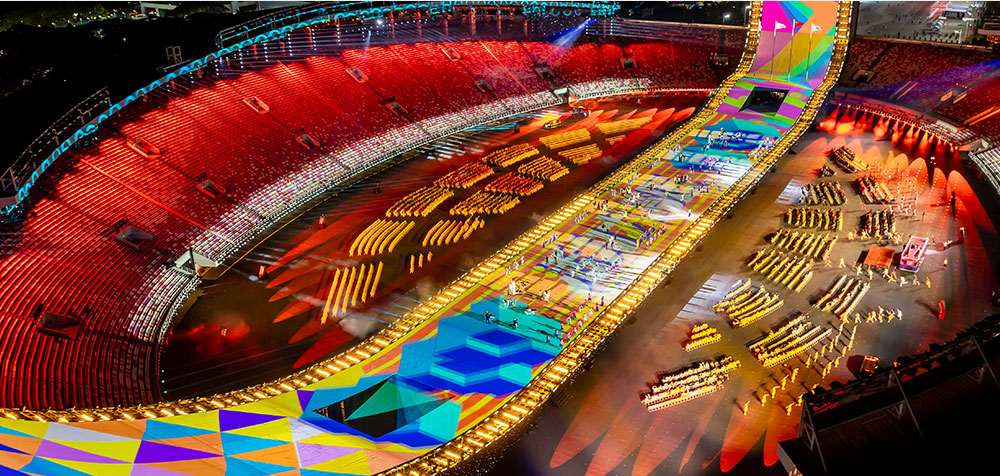 2025年11月9日晚,廣東奧林匹克體育中心華光流轉(zhuǎn)、燈火璀璨,中華人民共和國第十五屆全國運動會開幕式在萬眾矚目中盛大啟幕。作為首次由廣東、香港、澳門聯(lián)合承辦的體育盛會,這場以“圓夢未來”為主題的開幕式,秉持“國際水準(zhǔn)、中國氣派、嶺南風(fēng)韻、灣區(qū)魅力”為核心理念,通過科技與文化的深度融合,視覺敘事與空間美學(xué)的深度構(gòu)建,呈現(xiàn)了一場跨越時空的視聽盛宴。不僅展示了粵港澳傳統(tǒng)與現(xiàn)代交融、體育與藝術(shù)共生的繁榮圖景,更是一曲三地同心的盛大交響。